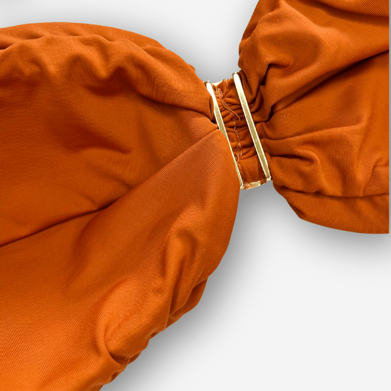 O modelo terracota é elegante e versátil, ideal para combinar com saídas de praia, chapéus e acessórios. A argola central dá destaque à peça, enquanto o caimento tomara que caia garante sofisticação e conforto.. Seu caimento impecável garante elegância e confiança em qualquer ocasião.